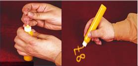 kapağı açılarak kalem içerisindeki keçeeye murekkep 10 ile 20 damla arasında damlatılarak dolum yapılır |
